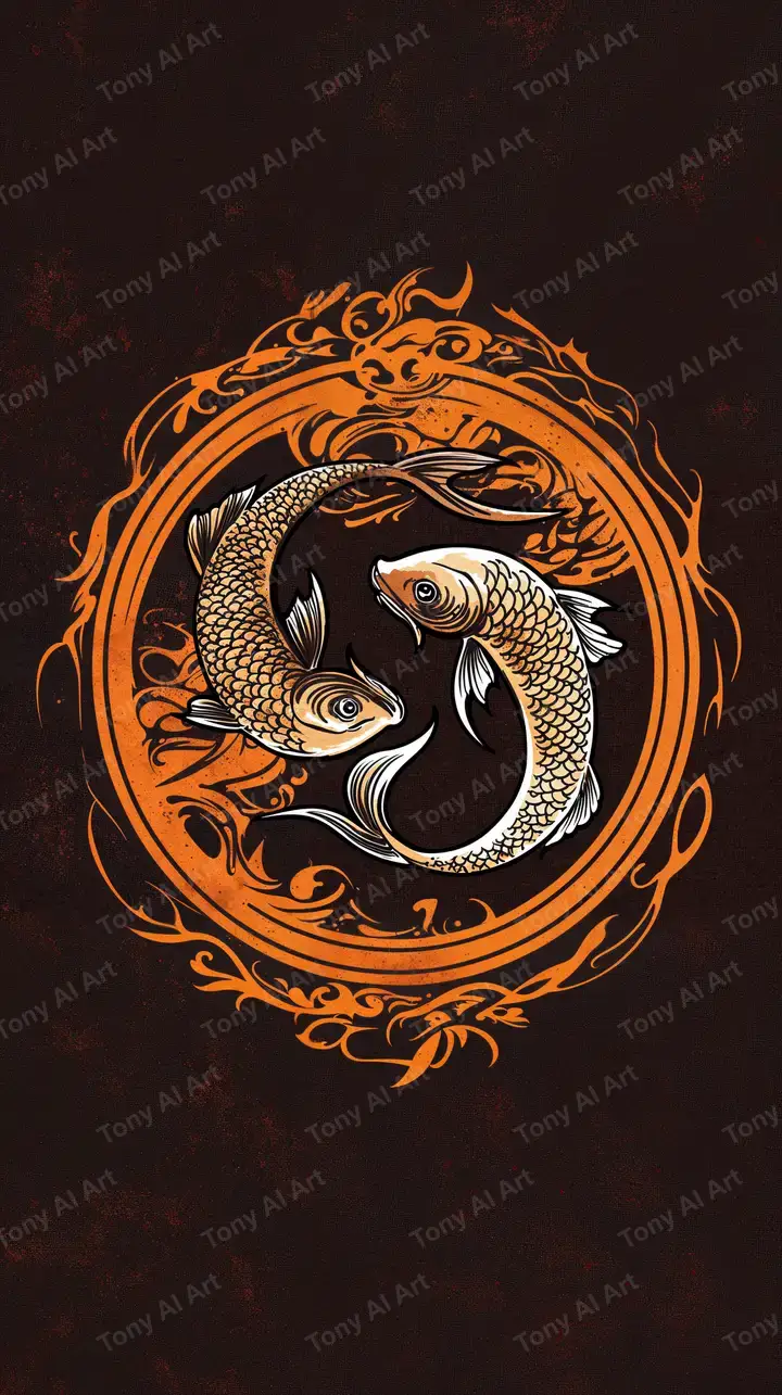 Hình nền cá koi phong thủy AI art, thiết kế chạm khắc ornamental, khung tròn trang trí, tải miễn phí 4K.