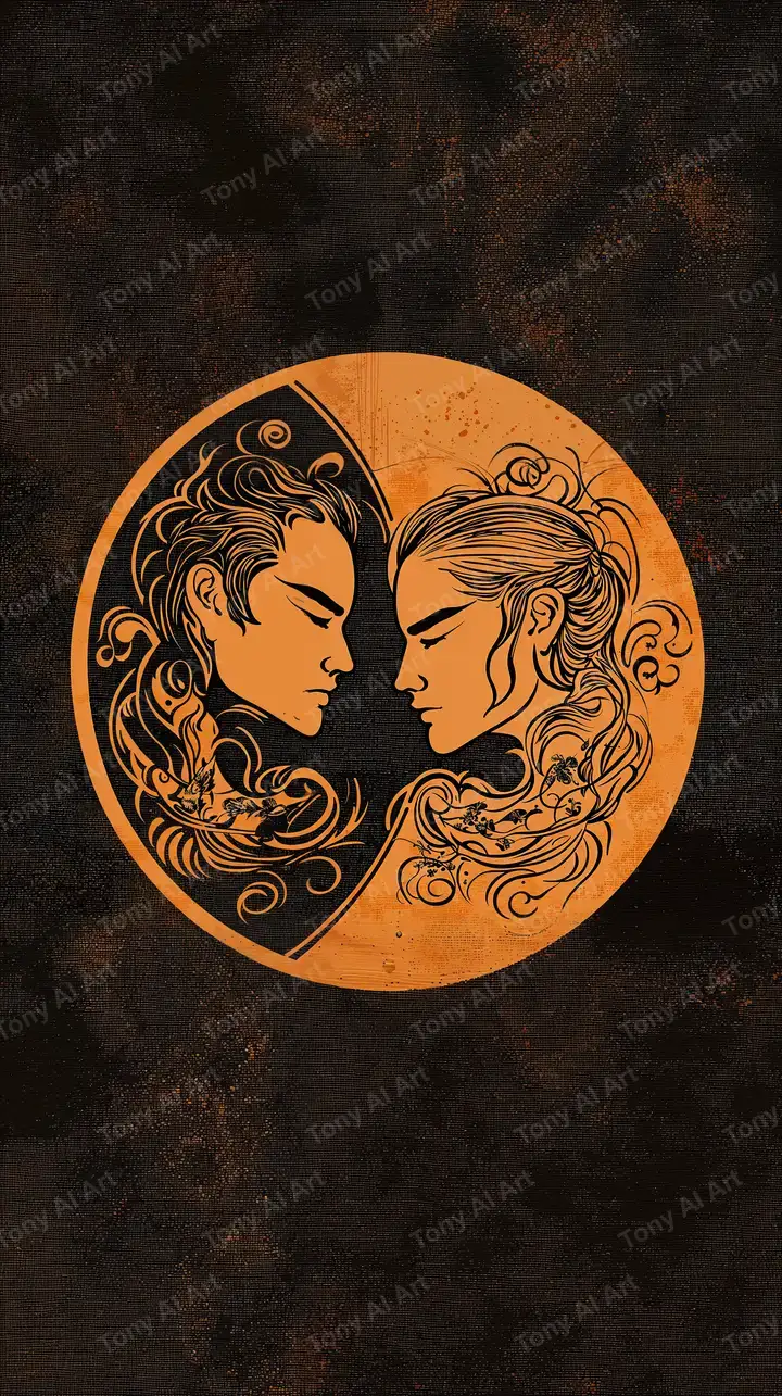 Hình nền cặp đôi phong thủy AI art với hiệu ứng neon glow, vòng tròn cân bằng, nền grunge texture, tải miễn phí 4K.