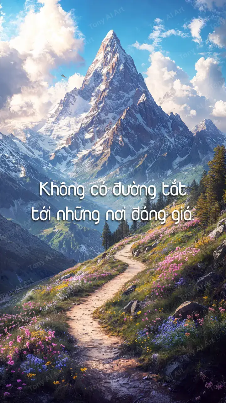 Hình nền núi cao con đường mòn hoa đồng cỏ AI art, bầu trời xanh ánh sáng mặt trời, tải miễn phí 4K.