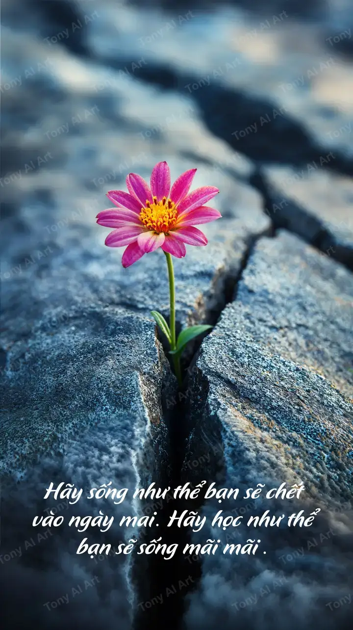 Hình nền hoa hồng sống lại giữa đá, quote motivational "Hãy sống như thể...", AI art 4K chất lượng cao, tải miễn phí.
