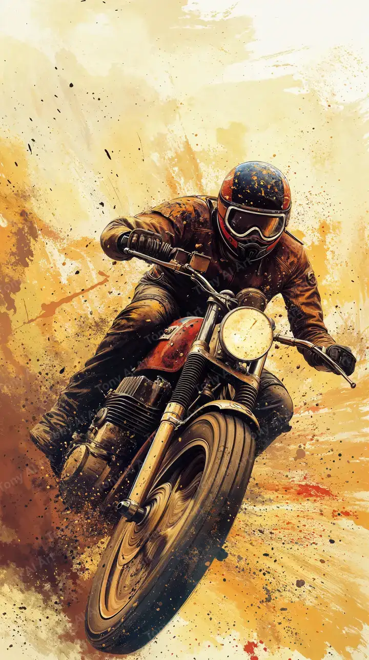 Hình nền xe máy retro với thanh niên lái mô tô cổ điển, hiệu ứng watercolor vàng cam, phong cách grunge splash art, tải miễn phí 4K.
