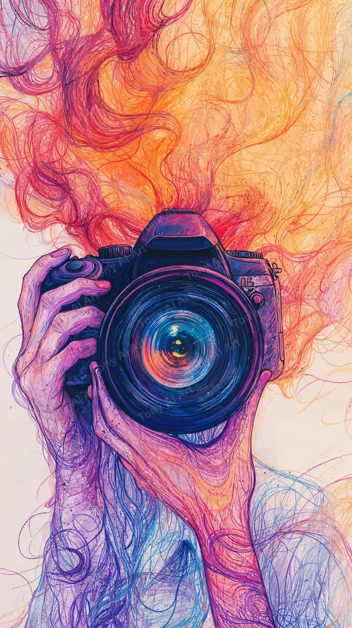 Hình nền AI art máy ảnh DSLR với hiệu ứng liquid watercolor gradient pink purple, neon cosmic glow, tải miễn phí 4K full HD.