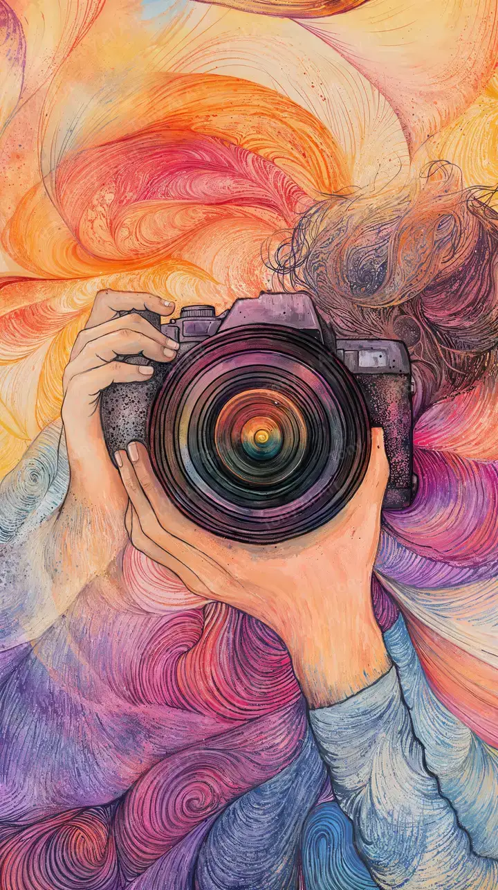 Hình nền máy ảnh gradient đầy màu sắc, tay cầm, hiệu ứng liquid art AI, tải 4K miễn phí.