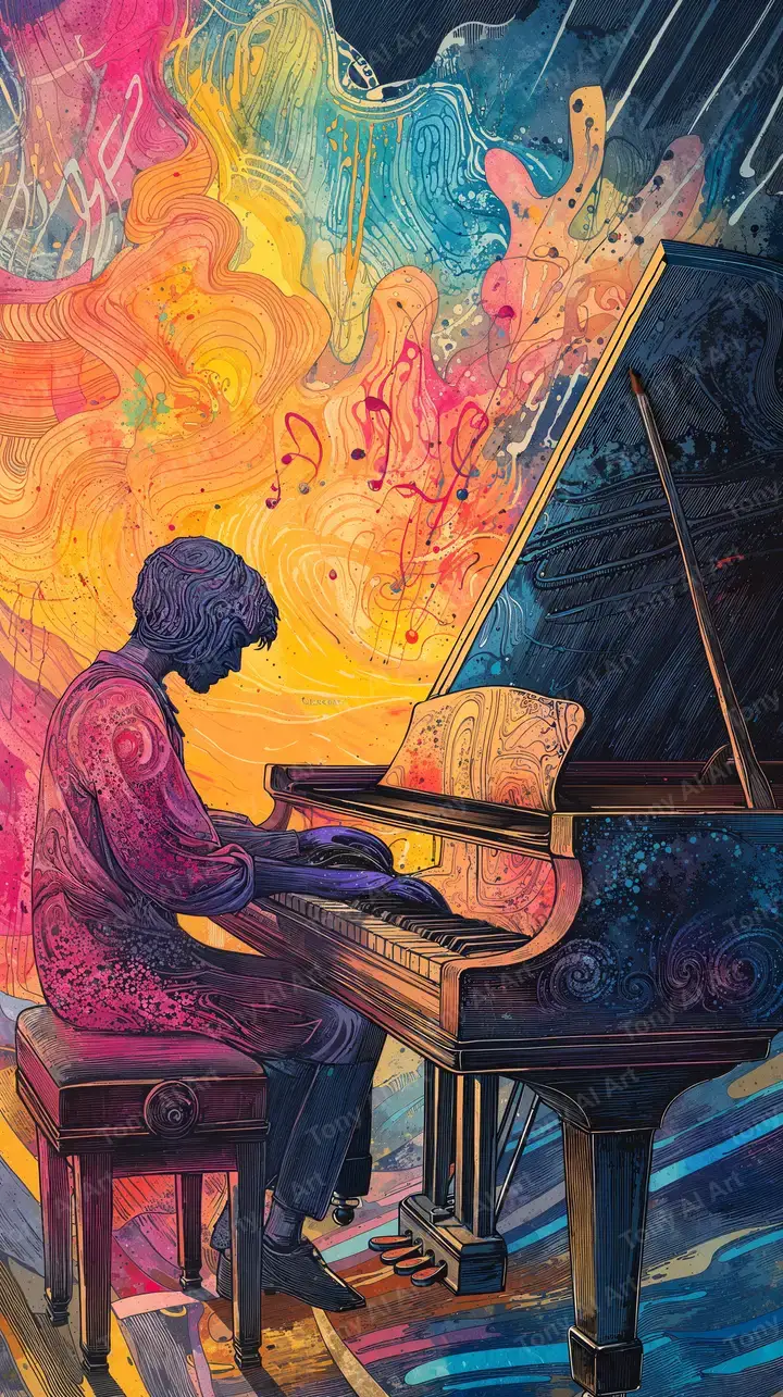 Hình nền piano cosmic với hiệu ứng neon psychedelic AI art, cảm giác âm nhạc sáng tạo, tải 4K miễn phí.