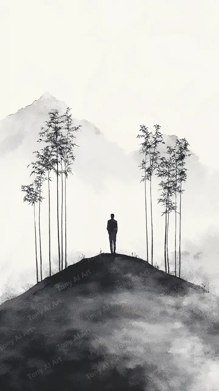Hình nền AI art tối giản, silhouette người đứng giữa rừng tre sương mù, hiệu ứng ink wash đen trắng, tải miễn phí 4K.