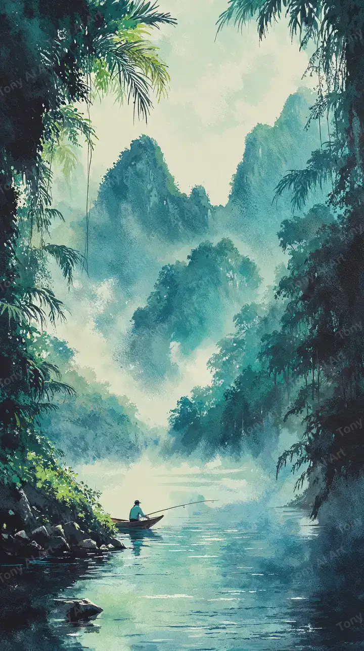 Hình nền AI art cảnh sông núi sương mù, phong cách tranh Á Đông, ngư thư trên thuyền, hiệu ứng mây lãng mạn, tải 4K miễn phí.