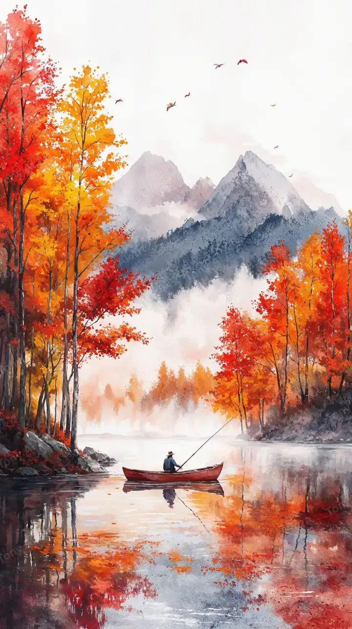 Hình nền AI art phong cảnh mùa thu sương mù, style watercolor, câu cá trên hồ giữa rừng lá đỏ cam. Tải miễn phí 4K.