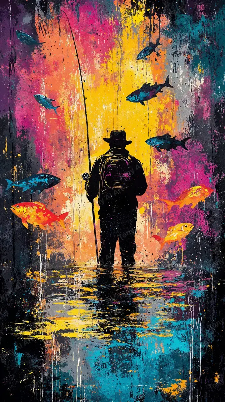 Hình nền AI art siêu đẹp với fisherman đứng giữa neon splash effects, cá bay xung quanh, hiệu ứng graffiti colorful. Tải miễn phí 4K.