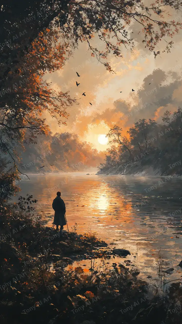 Hình nền hoàng hôn thiên nhiên AI art, cảnh người đứng bờ sông với cây cối vàng cam, ánh sáng mặt trời phản chiếu, đầy lãng mạn yên bình, tải 4K miễn phí.