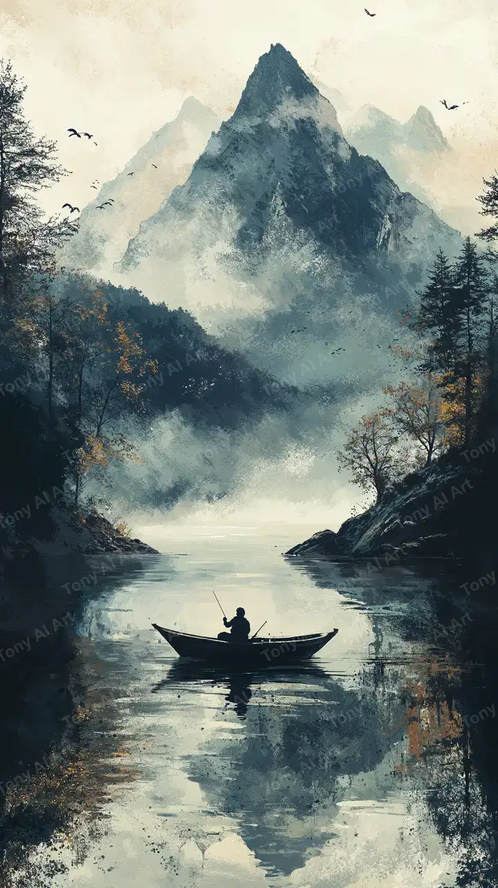 Hình nền AI art đẹp với cảnh hồ núi phủ sương, thuyền câu lặng lẽ, hiệu ứng watercolor tĩnh tâm. Tải miễn phí 4K.