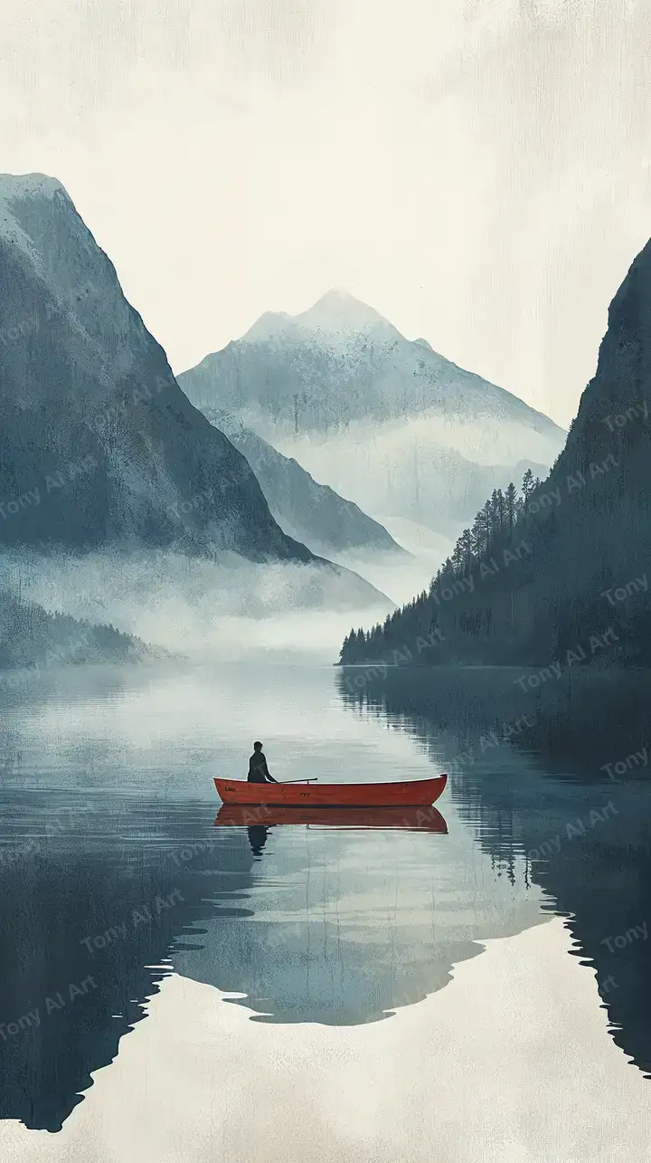 Hình nền AI art núi sương mù, thuyền đỏ tĩnh lặng giữa hồ, phong cách zen minimalist, tải miễn phí 4K.