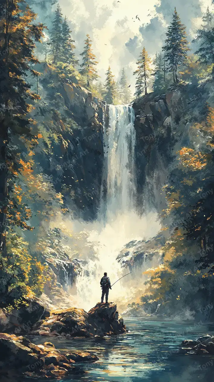 Hình nền thác nước rừng sâu với ánh sáng vàng huyền ảo, sương mù lãng mạn, tải miễn phí 4K.