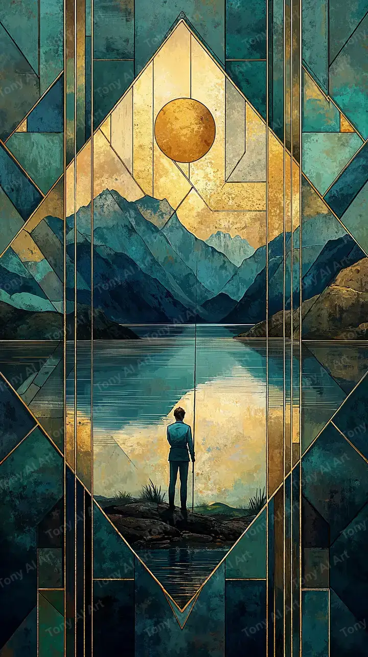 Hình nền AI art thiên nhiên với phong cách geometric art deco, gam màu xanh-vàng neon, hiệu ứng kính màu, tải miễn phí 4K HD.