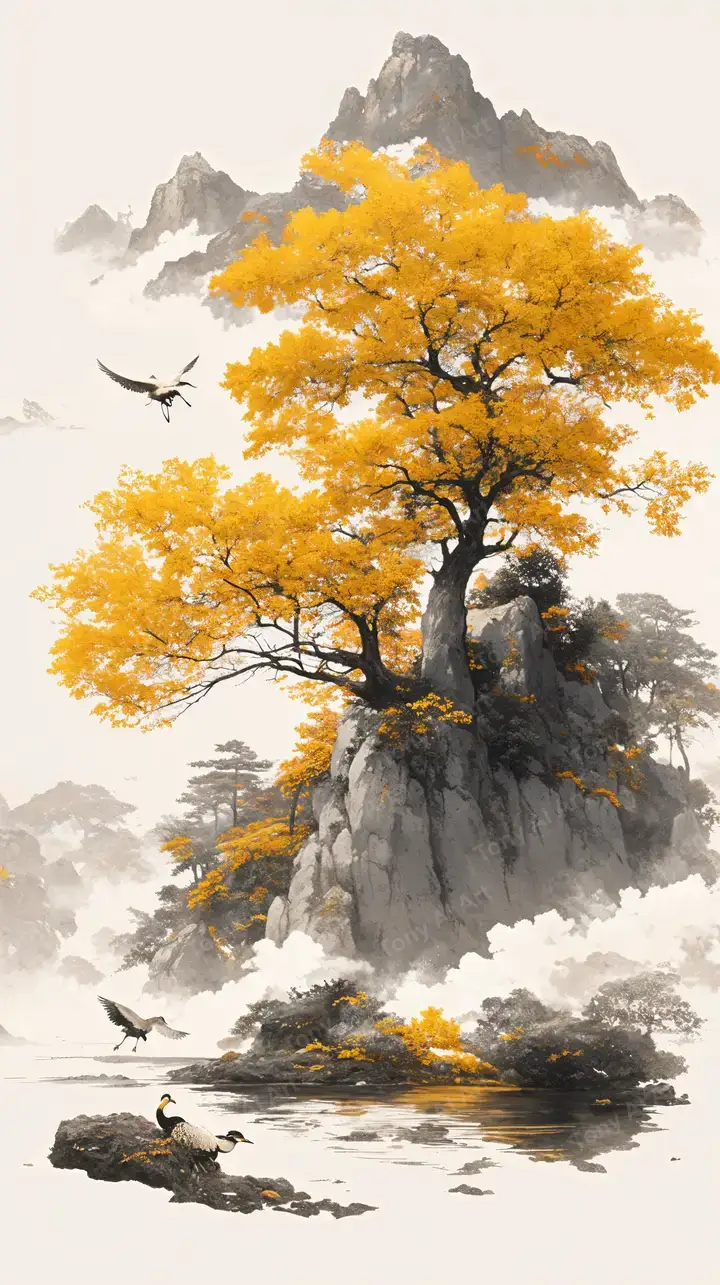 Hình nền cây vàng rực phong cảnh sương mù, gradient mềm hiệu ứng AI art, tải miễn phí 4K chất lượng cao.