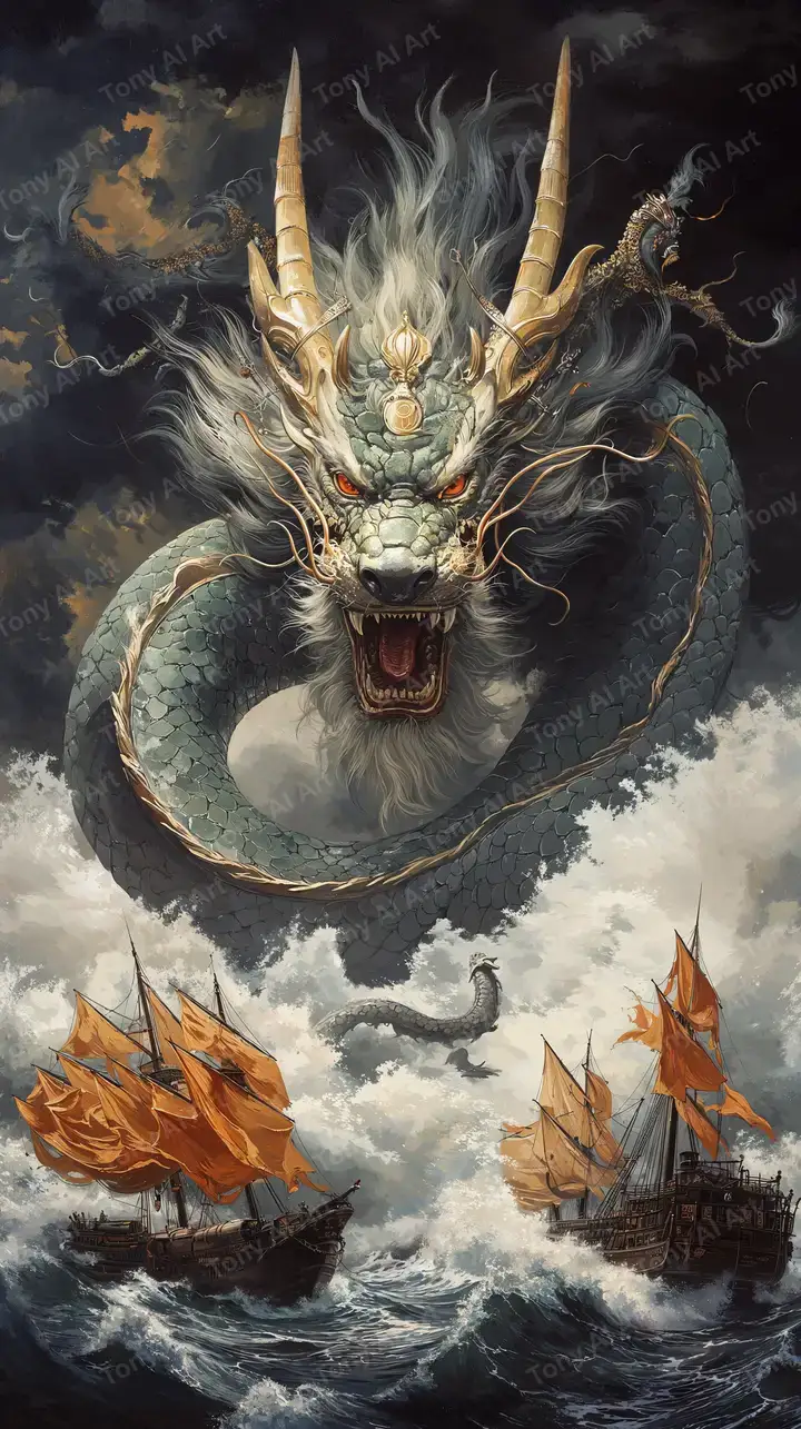 Hình nền rồng vàng thần thoại AI art, lửa mây cosmic, tàu buồm cổ, tải miễn phí 4K.