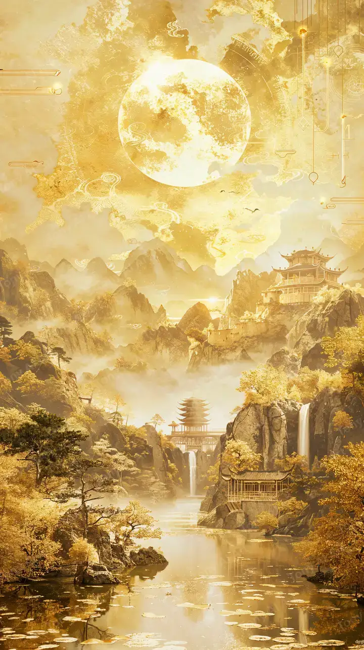 Hình nền pagoda vàng kim phong thủy AI art, mặt trăng cosmic neon, thác nước & núi hùng vĩ, tải miễn phí 4K.