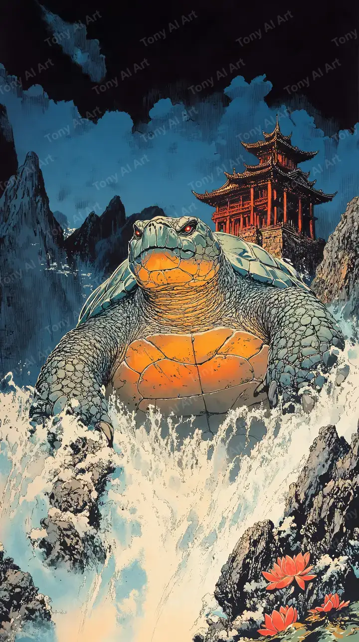 Hình nền rùa Quy Ngư phong thủy AI art, cảnh núi tuyết huyền thoại Á Đông, hiệu ứng watercolor cosmic, tải miễn phí 4K.