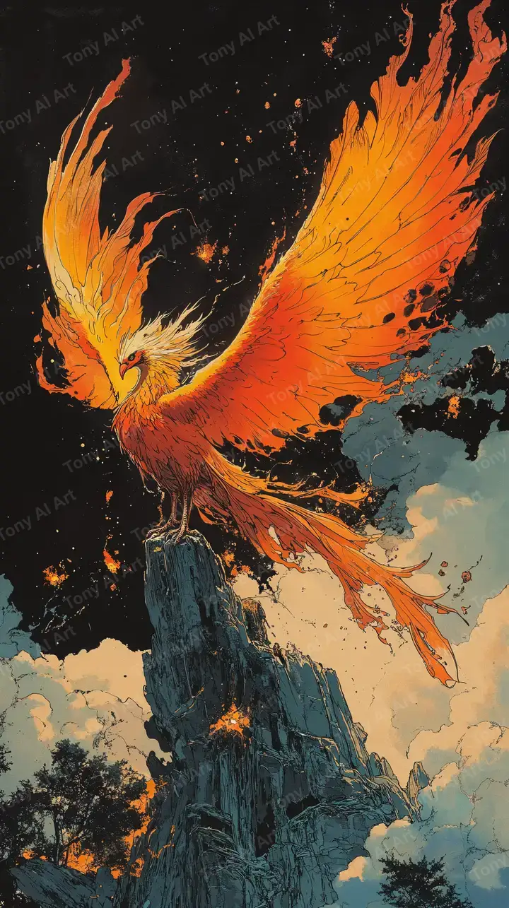 Hình nền phượng hoàng lửa vàng thần thoại AI art, hiệu ứng cosmic lửa nổi, tảng đá trên núi cao, tải miễn phí 4K.