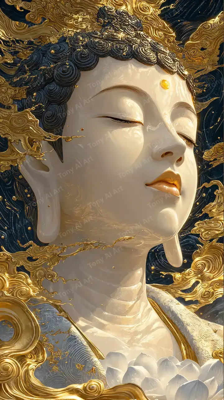 Hình nền Quan Âm vàng phong thủy với hiệu ứng nước lỏng, neon glow luxury, tâm linh cao cấp, tải miễn phí 4K.