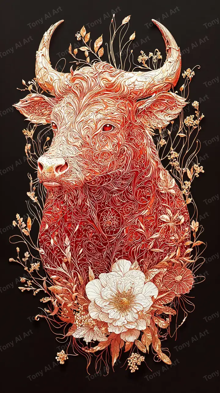 300 DPIBò Phong Thủy - Hoa Văn Đỏ Trắng - Hình Nền AI Art 4K