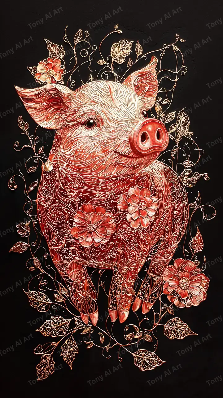 Hình nền lợn vàng phong thủy AI art, lối vẽ engraving trang trí hoa lá chi tiết, tải miễn phí 4K.