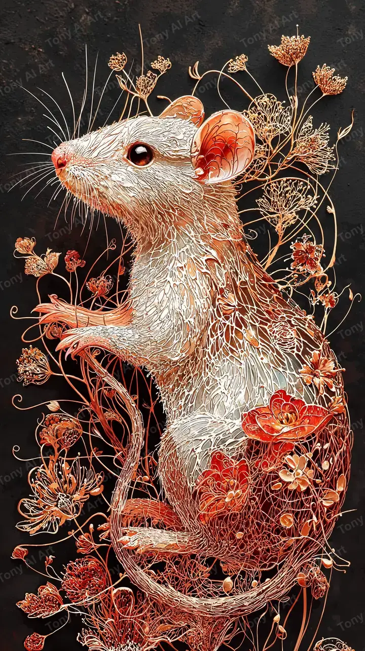 Hình nền chuột tý chi trang trí hoa lá, phong cách line art chi tiết, hiệu ứng trang trí thanh nhã, tải miễn phí 4K.
