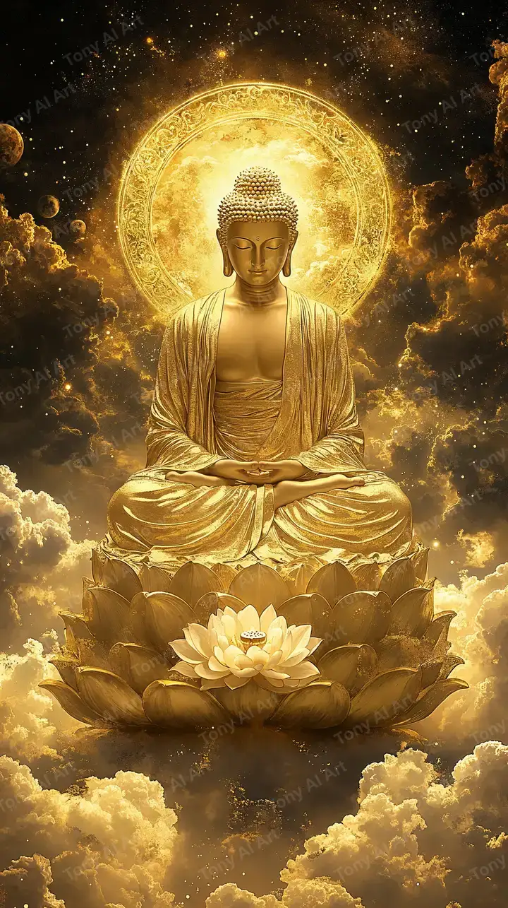 Hình nền Phật ngồi thiền halo vàng sáng, hiệu ứng cosmic neon, hoa sen, tải 4K miễn phí.