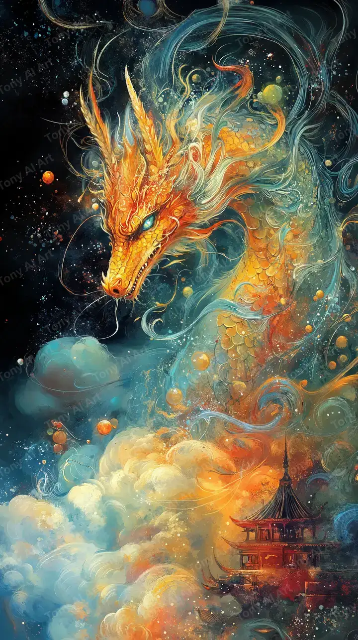 Hình nền rồng vàng phong thủy với hiệu ứng neon cosmic, chùa cổ, particle glow, tải 4K miễn phí.