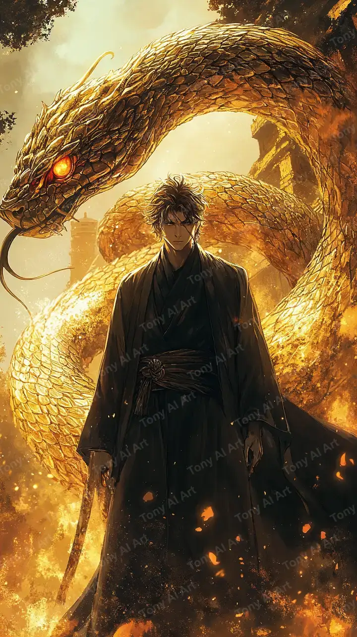 Hình nền rồng vàng phong thủy AI art chất lượng cao, nhân vật chiến binh với hiệu ứng neon cosmic, tải miễn phí 4K.