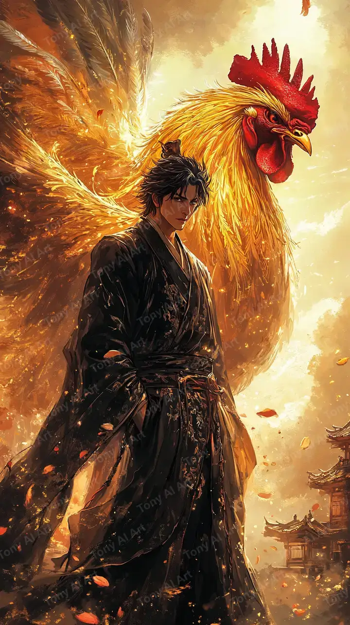 Ảo ảnh gà trống vàng kim kỳ bí bên cô gái áo dài, hiệu ứng lửa hùng vĩ, tải 4K miễn phí tại Tony AI Art.
