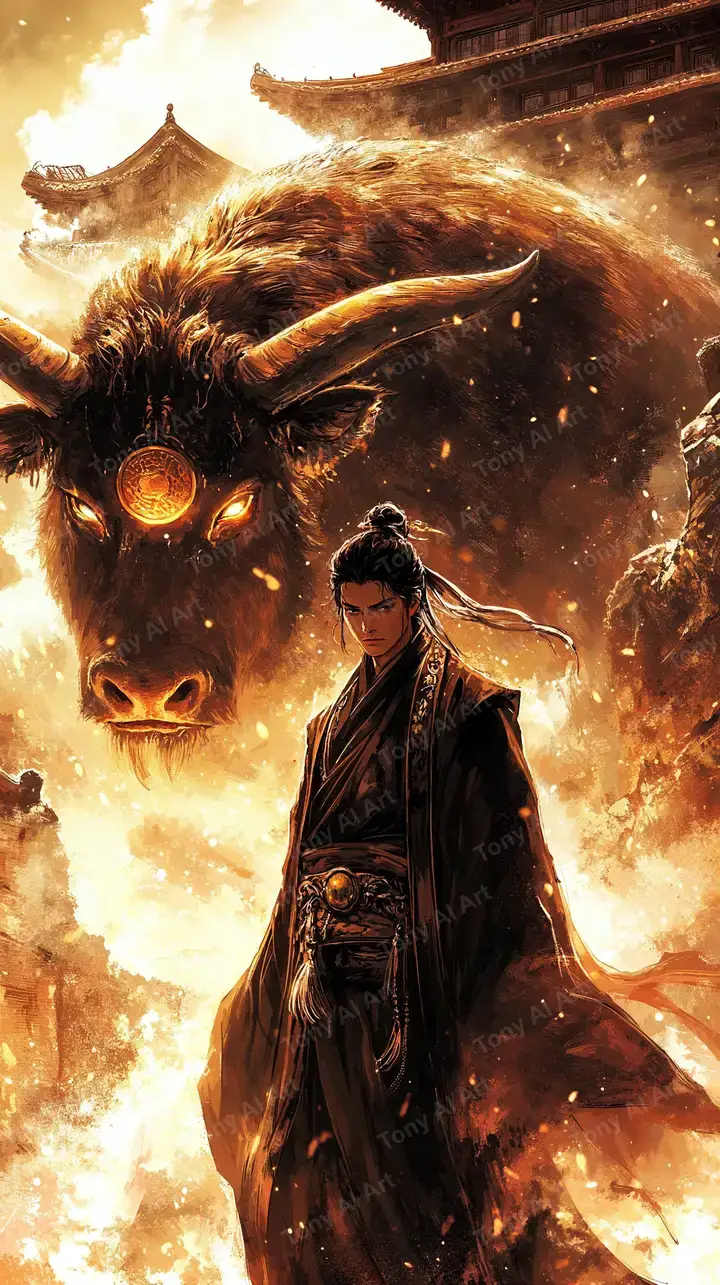 300 DPITrâu Thần Lửa Phong Thủy - Hình Nền AI Art 4K