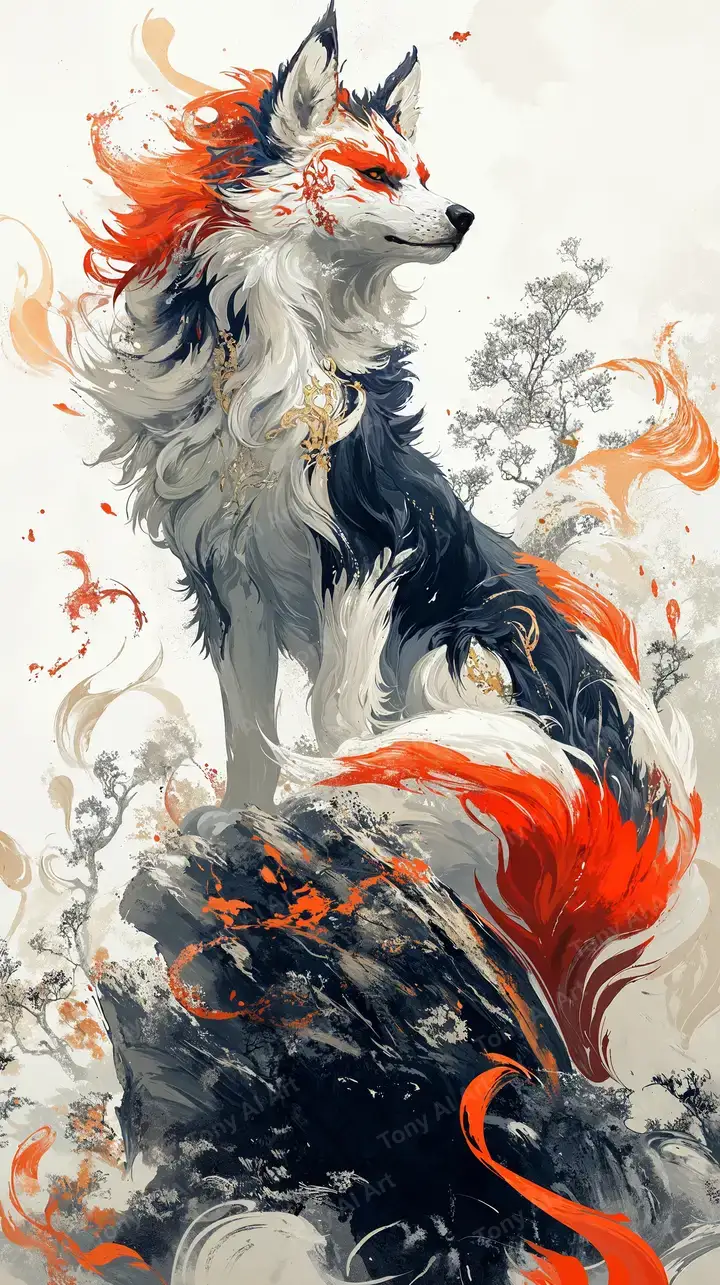 Hình nền kitsune watercolor với đuôi lửa cam đỏ, hiệu ứng ink splash và tương phản sáng tối, tải miễn phí 4K HD.