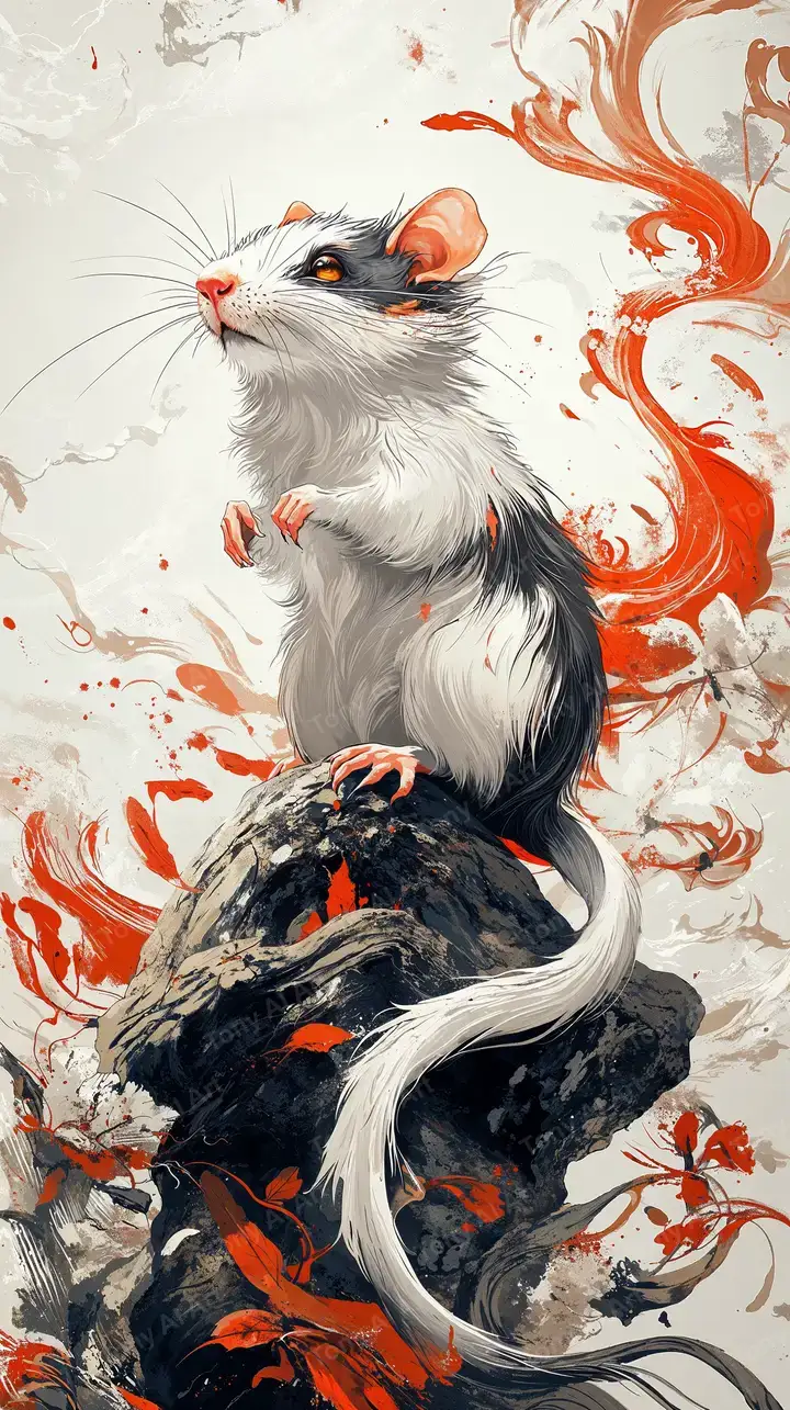 Hình nền chuột Tý phong thủy với hiệu ứng watercolor splashes, AI art cao cấp, tải miễn phí độ phân giải 4K.