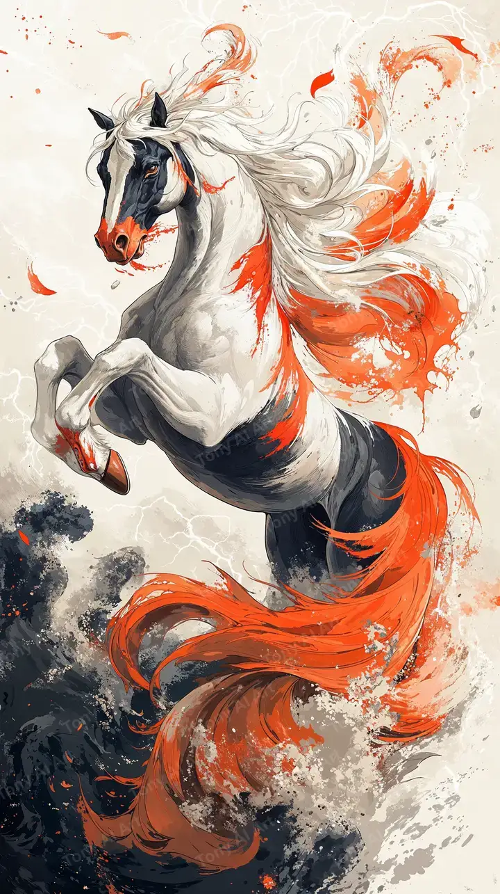 Hình nền ngựa trắng watercolor với splash effect cam đen, AI art ngẫu hứng tải miễn phí 4K.