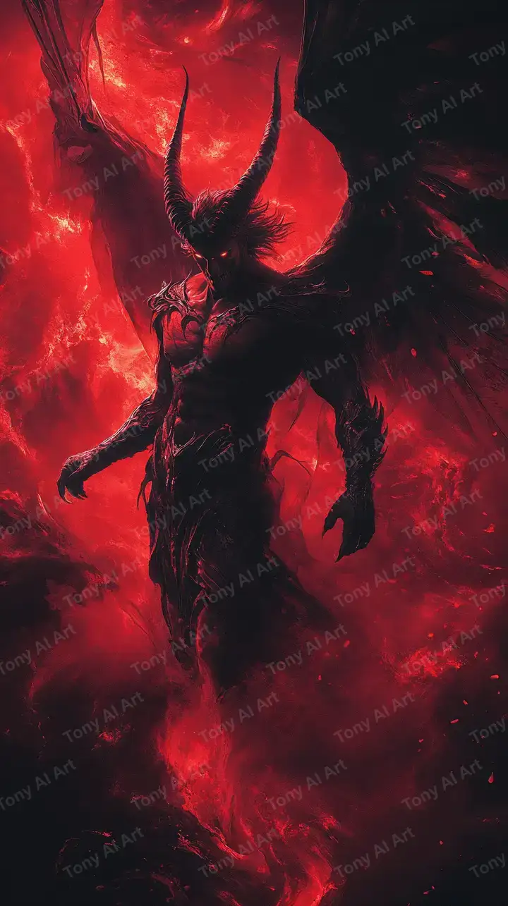Hình nền quỷ lửa cosmic với hiệu ứng plasma đỏ rực, phong cách digital art thần thoại, tải miễn phí 4K chất lượng cao.