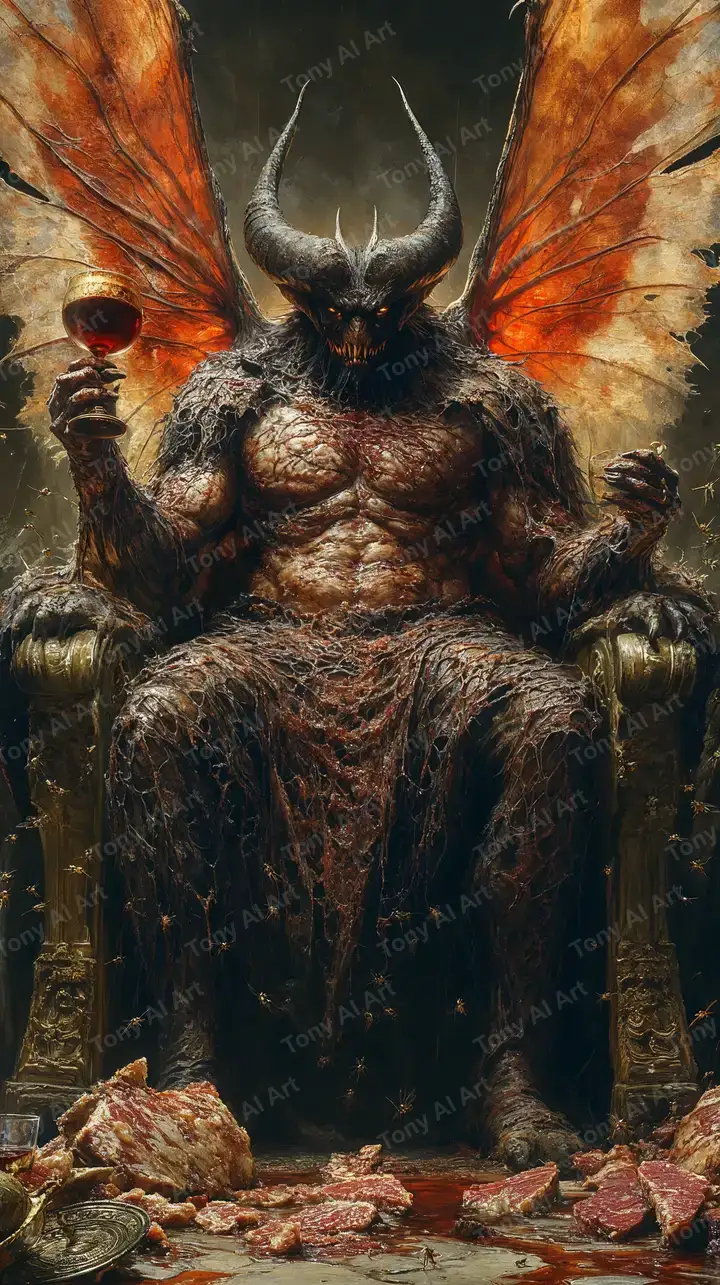 Hình nền quỷ vàng huyền bí ngồi trên ngai, hiệu ứng neon rực rỡ, phong cách dark fantasy AI art tải miễn phí 4K.