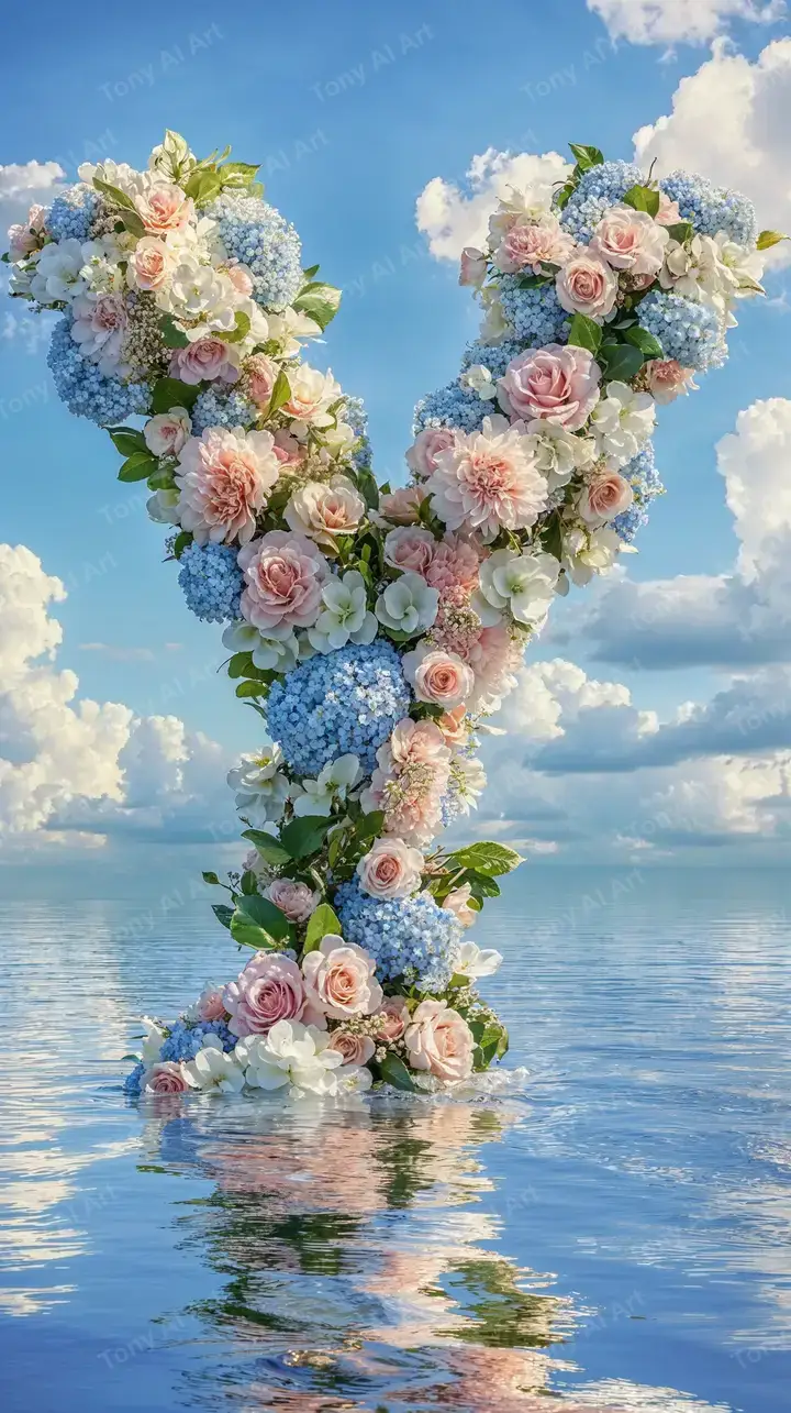 Hình nền AI art chữ Y từ hoa hồng và cẩm tú cầu xanh, bối cảnh biển yên bình, phản chiếu mềm mại trên nước. Tải miễn phí 4K.