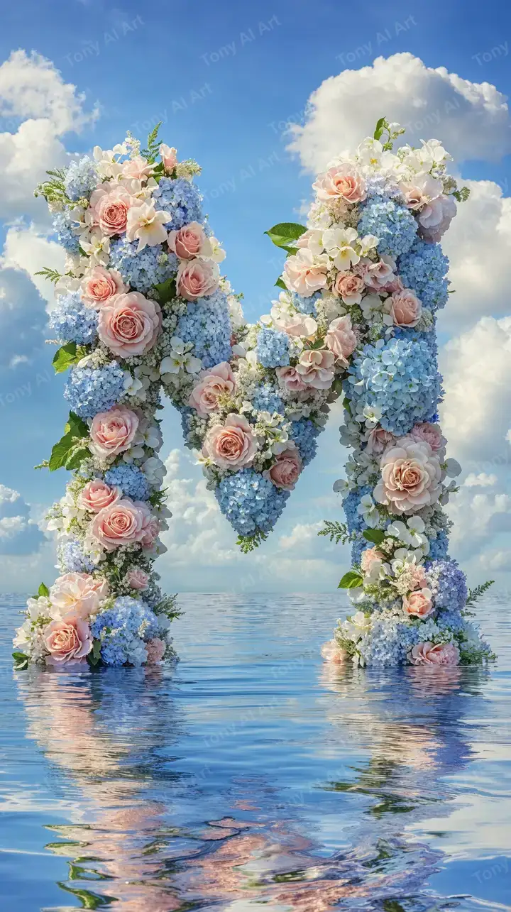 Hình nền AI art chữ W từ hoa hồng hồng, cẩm tú cầu xanh, phản chiếu nước mộng mơ, tải 4K miễn phí.