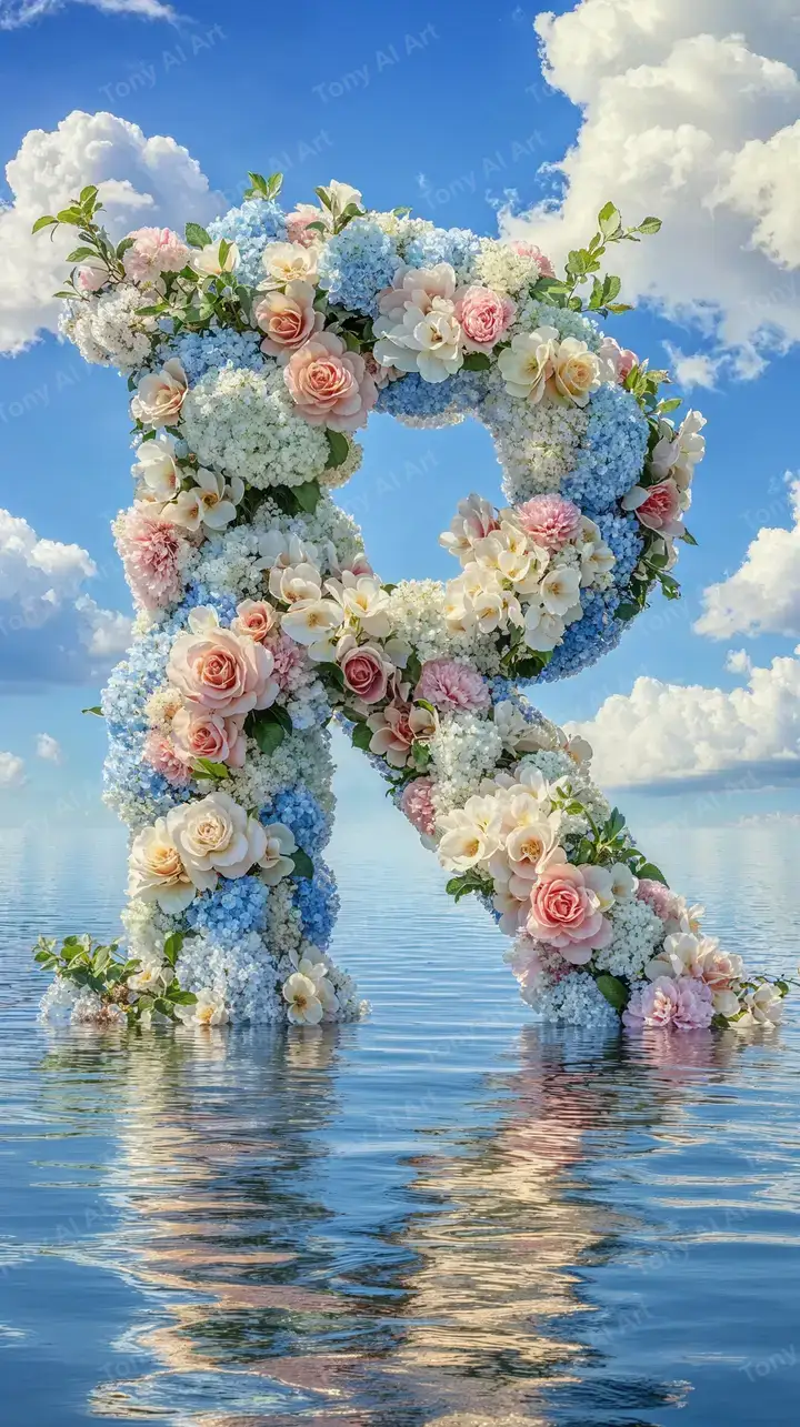 Hình nền chữ R tạo từ hoa hồng và lưỡi bò xanh, phản chiếu nước biển, bầu trời mây lãng mạn - AI art ảo tuyệt đẹp tải miễn phí 4K.