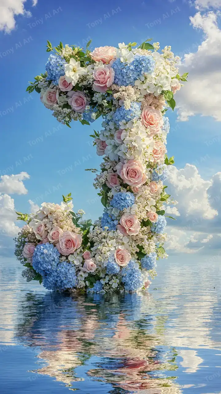 Hình nền số 5 tạo từ hoa hydrangea xanh, hoa hồng, hiệu ứng phản chiếu nước sang trọng. AI art 4K, tải miễn phí.