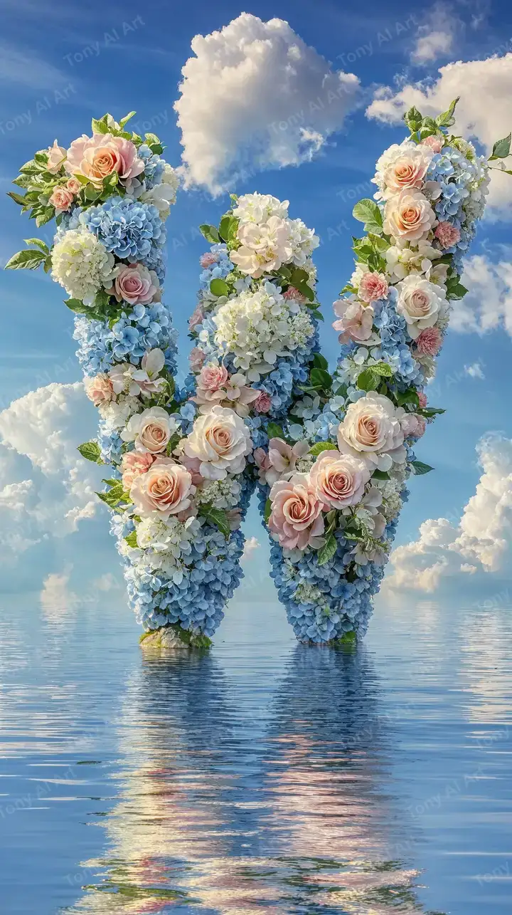 Hình nền AI art chữ W từ hoa hồng và cẩm tú cầu xanh với phản chiếu nước, thiết kế sang trọng và lãng mạn, tải miễn phí 4K.