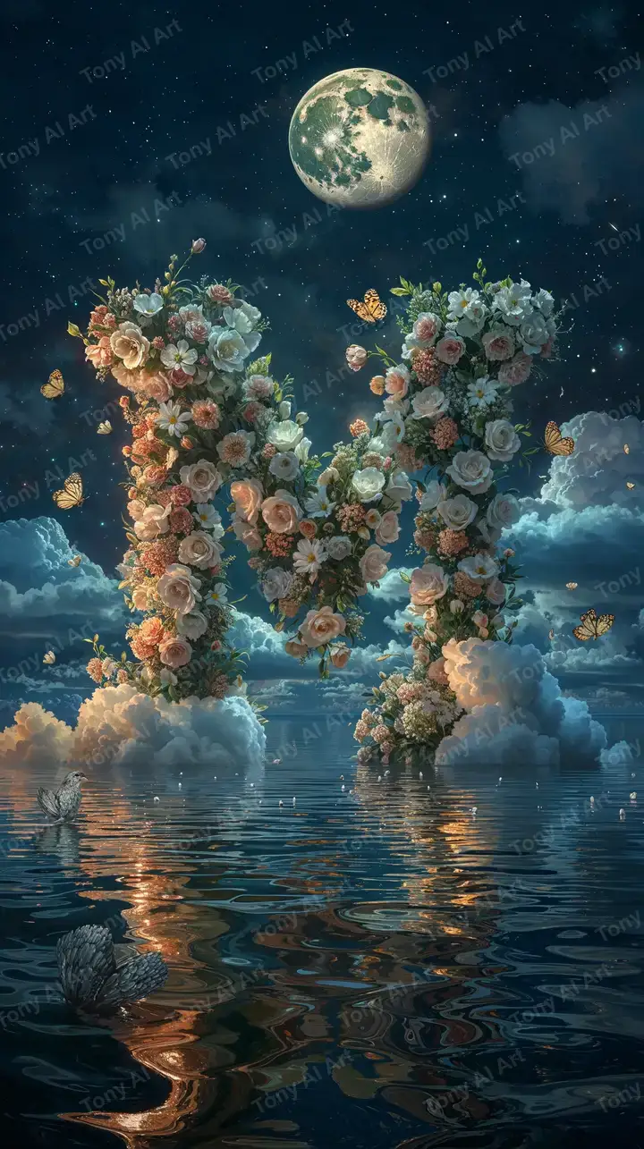 Hình nền AI art chữ Y hoa hồng vàng dưới ánh trăng sáng, nước xanh phản chiếu, hiệu ứng surreal phát sáng, tải miễn phí 4K.