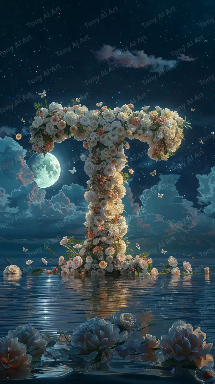 Hình nền AI art tác phẩm siêu thực: khối hoa vàng dạng cổ máy nổi trên nước dưới trăng sáng, bầu trời sao cosmic neon glow, tải miễn phí 4K.