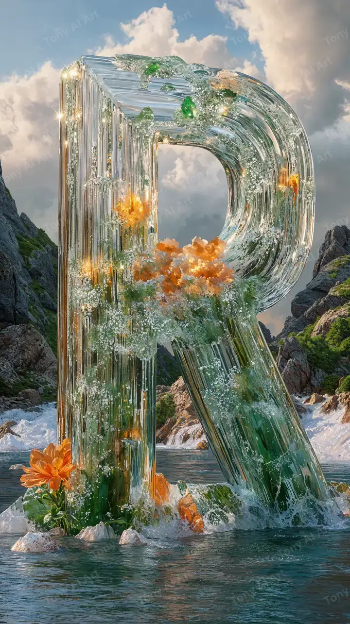 Hình nền R nước xanh turquoise với hoa cam, cây xanh phủ núi đá, sương mù mơ mộng, hiệu ứng digital surreal tải 4K miễn phí.