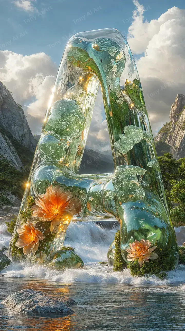 Hình nền AI art siêu thực với cấu trúc tự nhiên khổng lồ, thác nước xanh, hoa cam phát sáng. Tải miễn phí 4K, hiệu ứng ánh sáng cosmic.