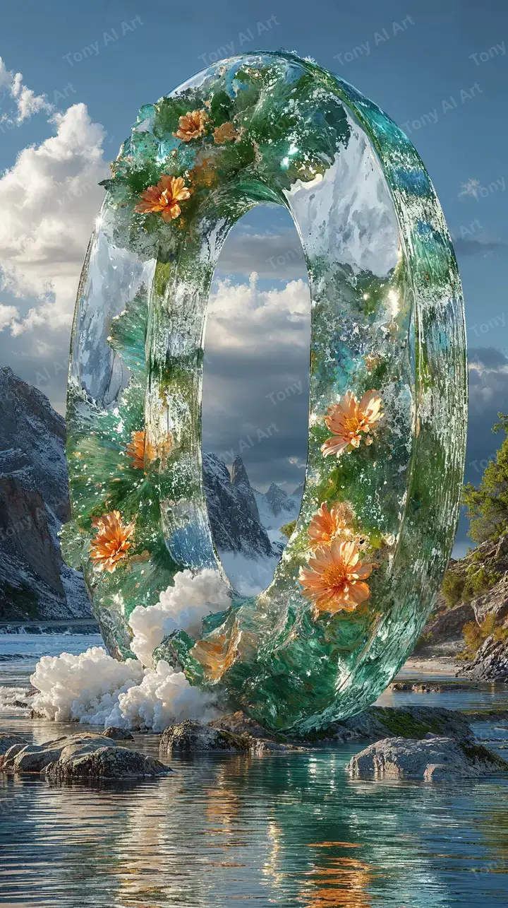 Hình nền cổng hoa AI art: vòng xanh lá cây trang trí hoa vàng cam, núi đá, nước biển, tâm linh phong thủy, tải 4K miễn phí.