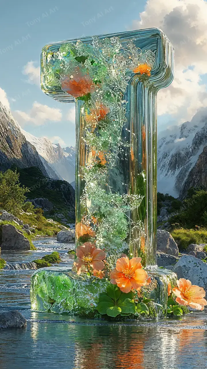 Hình nền chữ I kính chứa hoa cam, cây xanh, phong cảnh núi sông. Tác phẩm AI Art siêu thực, hiệu ứng neon nature blend, tải miễn phí 4K full HD.