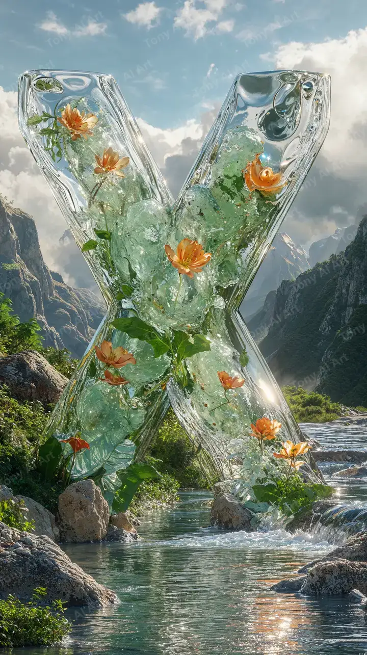 Hình nền AI art thiên nhiên với hoa cam trong pha lê hình X, dòng sông, núi non, hiệu ứng surreal dreamy 4K tải miễn phí.