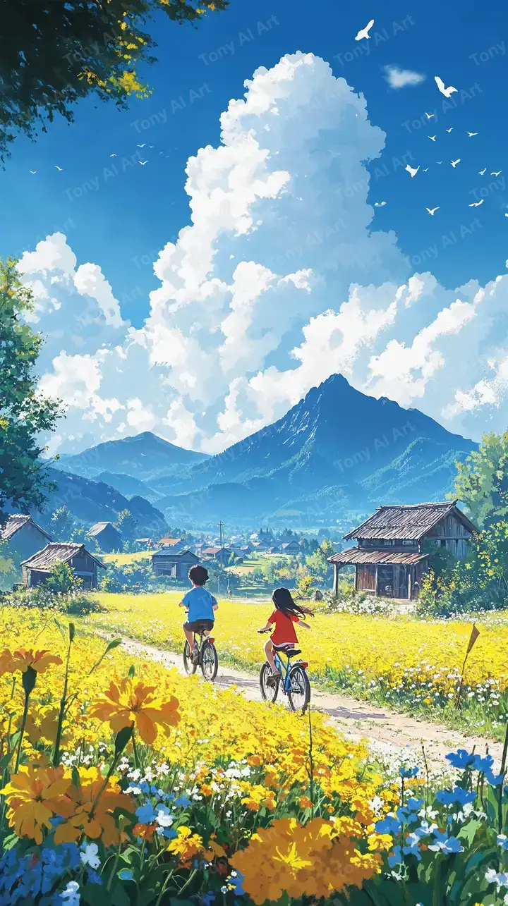 Hình nền AI art cảnh quê hương, xe đạp qua cánh đồng hoa vàng, núi xanh lam, hiệu ứng watercolor ấm áp, tải miễn phí 4K.