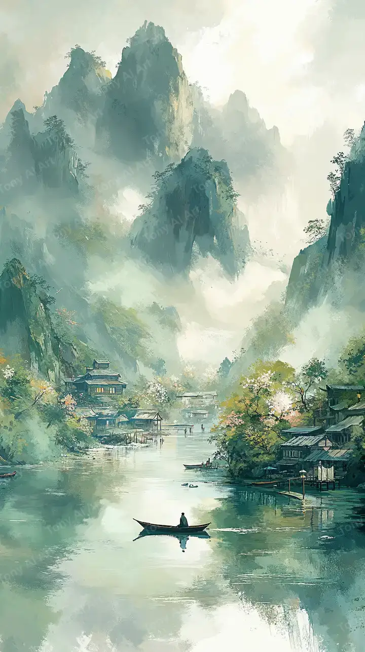 300 DPINúi Cao Phong Thủy Sương Mù - Hình Nền AI Art Á Đông